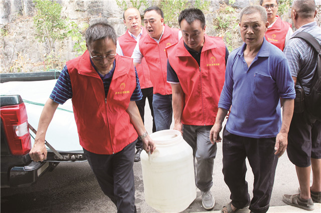 喬梓鄉(xiāng)政府工作人員為群眾送水。 楊麗媛 攝影