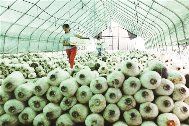 潤溪鄉(xiāng)白果坪平菇基地,連續(xù)高溫天氣對平菇生長造成一定影響,基地組織村民對平菇及時(shí)采收銷售。 廖 唯 攝影