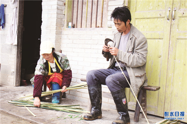 許業(yè)彬夫妻倆在編制農(nóng)具。 融媒體記者 李亞軍 攝影