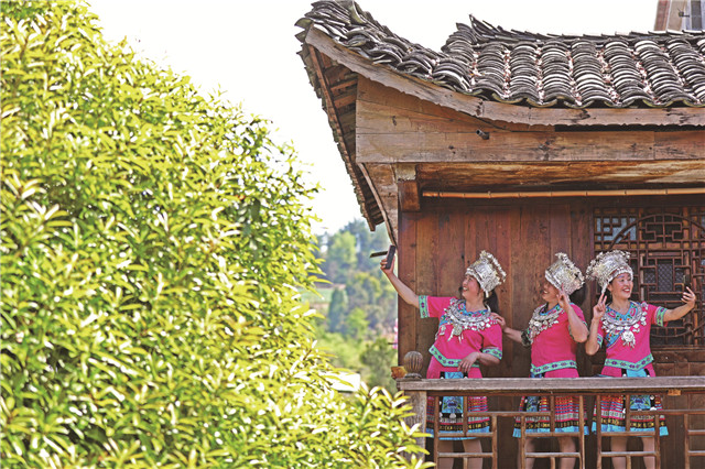 4月8日,在梅子埡鎮(zhèn)佛山村7組的古苗寨,游客身著苗族服裝,在苗家吊腳樓上拍照游玩,體驗(yàn)古苗寨的獨(dú)特韻味。