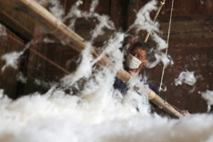 “現(xiàn)在,很多人都放棄了傳統(tǒng)制作棉絮的手藝?!敝x剛?cè)A說,隨著生產(chǎn)技術(shù)的進步,機器制作棉絮逐漸取代了純手工彈棉花,但是,每當(dāng)有人提出需要用傳統(tǒng)手工制作棉絮的時候,他也會背起弓竿、掛上彈花弓,用傳統(tǒng)手法制作棉絮。