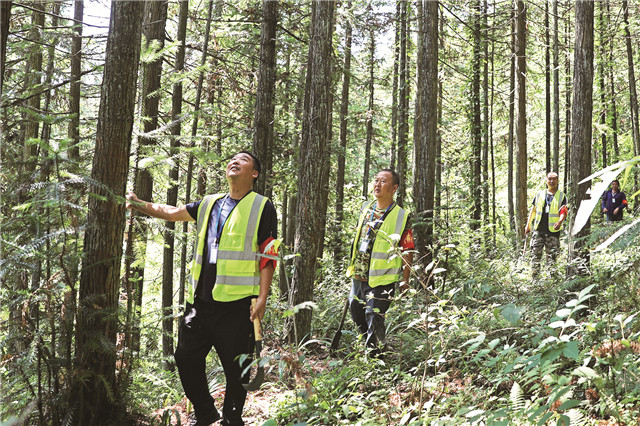 8月10日,在石盤鄉(xiāng)石新村,縣國有林場雙龍管護(hù)站工作人員正在巡山護(hù)林。 趙勇 攝影
