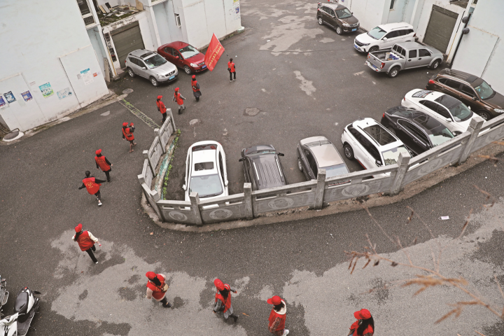 志愿者集中出發(fā)前往各負責區(qū)域開展疫情防控宣傳。