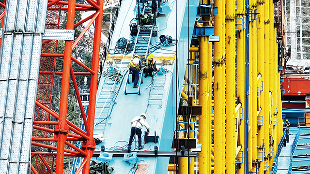 清水坪大橋正在進(jìn)行拱肋安裝。