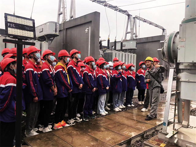 圖為工作人員正在靛水變電站為學(xué)生們講解各個(gè)設(shè)施設(shè)備工作原理及作用。