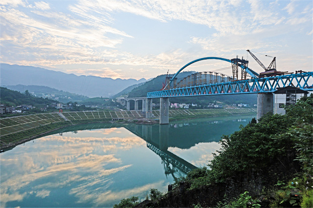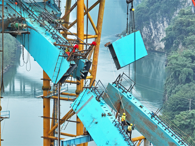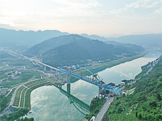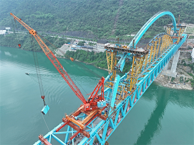 6月8日,在漢葭街道渝湘高鐵彭水段清水坪烏江大橋建設(shè)現(xiàn)場,正在吊裝拱肋,為合龍做最后的準(zhǔn)備工作。