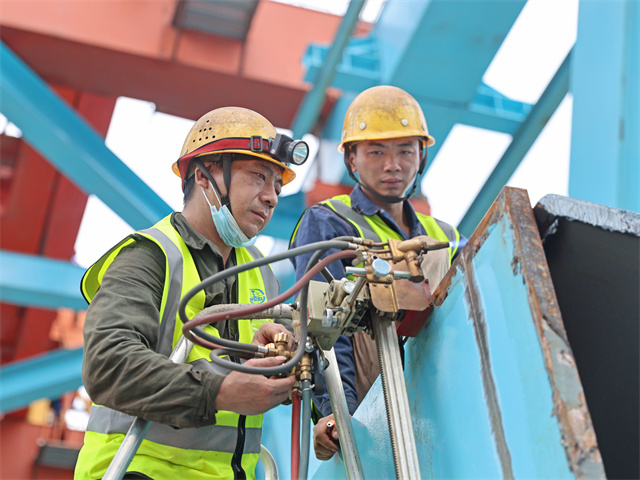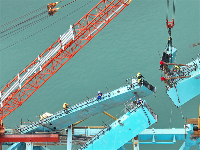 工人正在抓好拱肋部件修整,為拱肋提升合龍做好準(zhǔn)備。